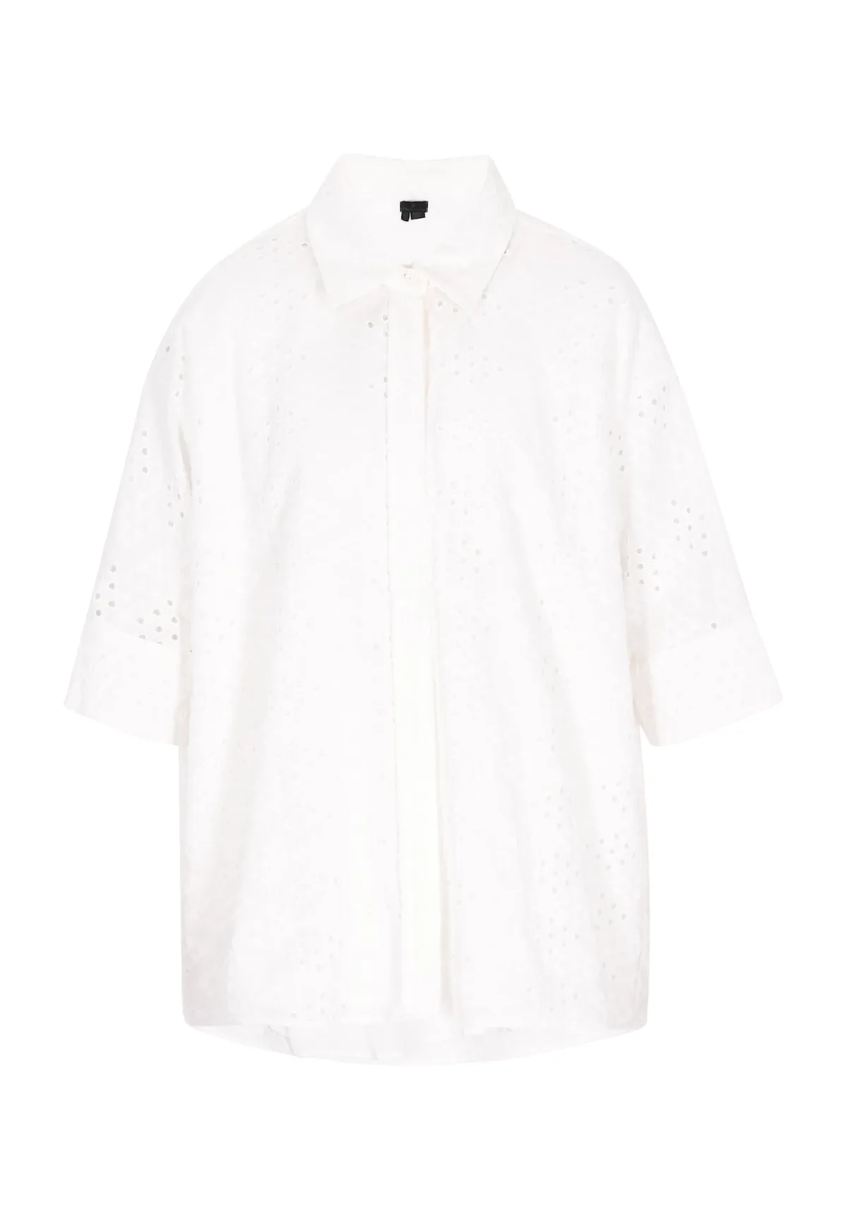 Blouse type: Blouseshirt; Design: Knop sluiting; Type sluiting: Knoopsluiting; Materiaal: Katoen; Motief: Effen; Kraag: Kentkraag; Details: Borduursels, Mesh; Extra's: Op staal naden; Pasvorm: Losse pasvorm; Armlengte: Halve mouw; Lengte: Lange pasvorm