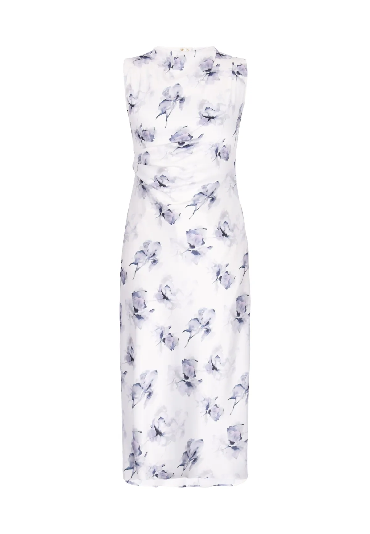 Design: Rug rits; Type sluiting: Ritssluiting; Materiaal: Satijn; Halstype: Opstaande kraag; Motief: Bloemenprint; Soort bandjes: Brede bandjes; Details: Gedrapeerd; Extra's: All-over patroon; Lengte: 7/8 lengte; Snit: Uitlopend; Pasvorm: Normale pasvorm; Armlengte: Mouwloos