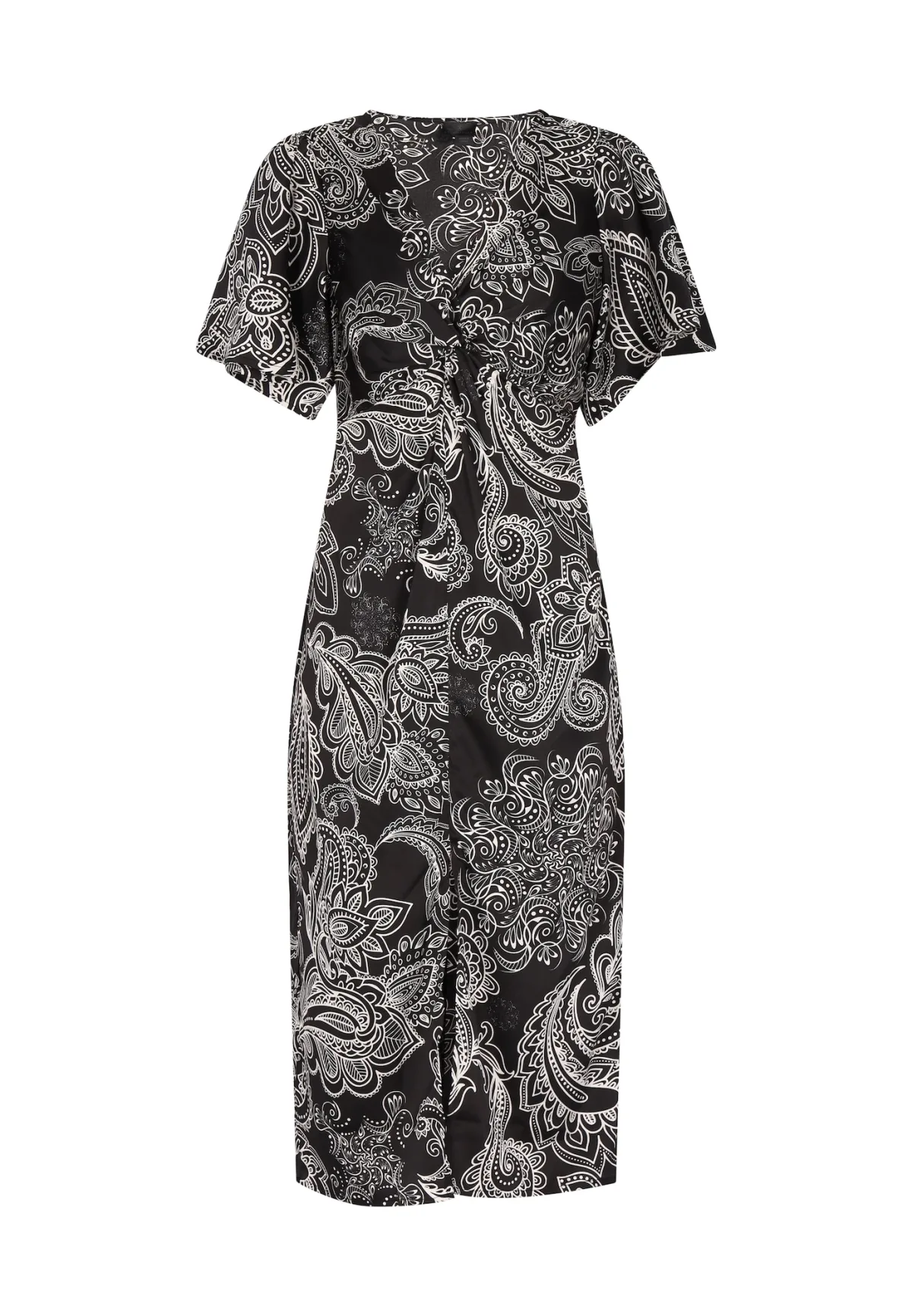 Deze knielange jurk heeft een betoverend patroon van complexe, wervelende motieven die doen denken aan traditionele paisley-ontwerpen en straalt charme en verfijning uit. Het heeft korte mouwen, een ronde halslijn en een aansluitende taille, geaccentueerd door een stropdas of riem voor een getailleerde look. Jurk