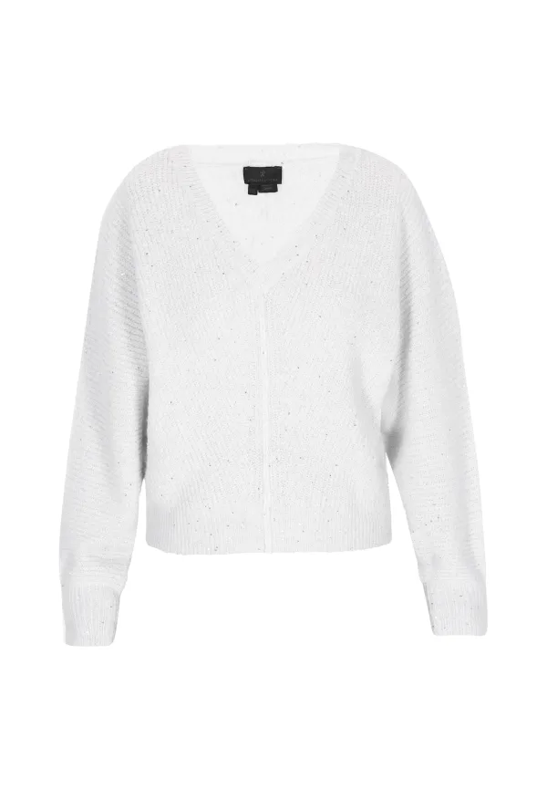 Design: Vleermuismouwen; Type sluiting: Slip; Materiaal: Knitwear; Halstype: V-hals; Motief: Mélange; Details: Pailletten; Extra's: Glitterend; Pasvorm: Normale pasvorm; Armlengte: Lange mouw; Lengte: Normale lengte