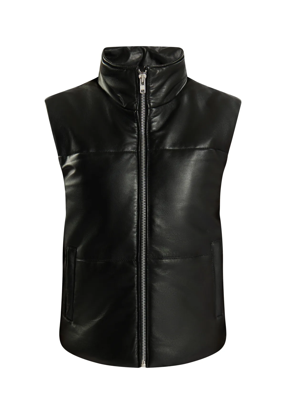 Blijf stijlvol warm met deze casual versie van leren bovenkleding van DreiMaster Vintage. Het gewatteerde vest van lamsleer heeft een mouwloos silhouet met ritssluiting, hoge opstaande kraag en zijzakken. De brede schouders en doorgestikte naden geven het it-piece een bijzonder moderne touch. Waistcoat