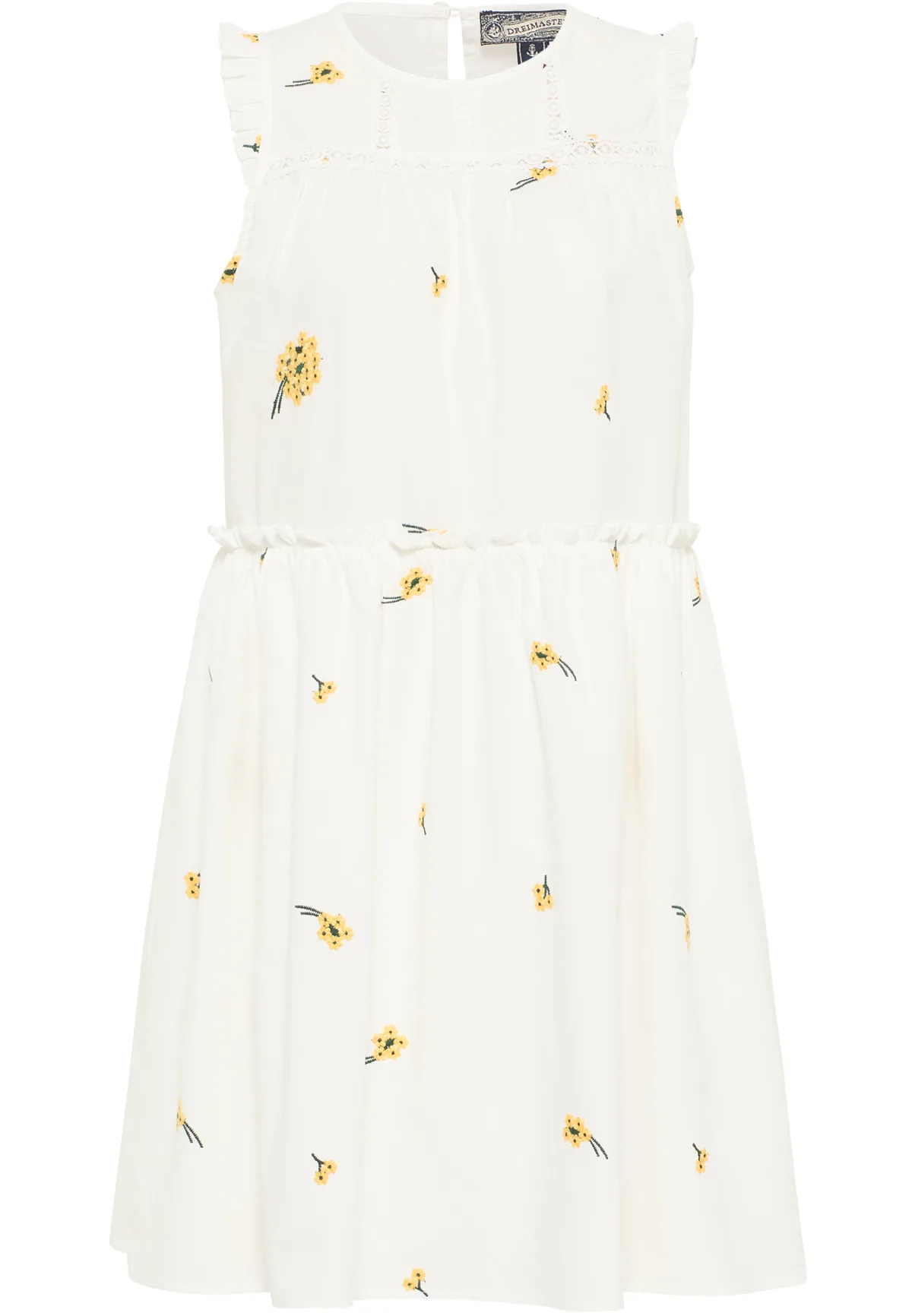 Geen voering/geen voering De subtiel geborduurde midi-jurk van DreiMaster Vintage is gemaakt van puur katoen en heeft een losse pasvorm. Het kant aan de halslijn, de kleine volantmouwen en de ruche aan de rok zorgen voor een romantisch accent. De sfeervolle look wordt afgerond door de ronde halslijn met klein knoopje aan de achterkant. midi-jurk