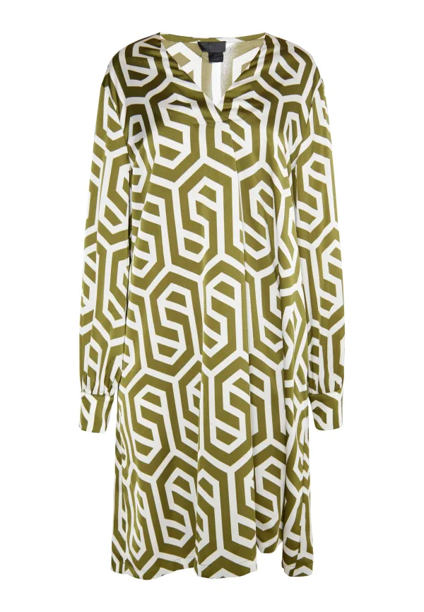 Deze jurk van DreiMaster Klassik combineert stijl met comfort. Het relaxte silhouet is gemaakt van luxueus, soepel materiaal en voorzien van een geometrische print. De V-hals gaat over in een lange stolpplooi, waardoor de jurk een mooi volume krijgt. De lange mouwen met manchetten complementeren de eigentijdse stijl. midi-jurk