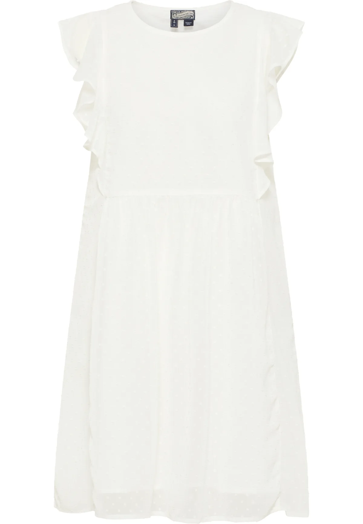 De vrouwelijke boho-stijl van DreiMaster Vintage geeft deze jurk met ruches een bijzondere look. Het delicate, semi-transparante materiaal versierd met kleine stippen en de ruches aan de zijkant zorgen voor een trendy touch. Het losvallende model wordt vakkundig afgerond door de ronde halslijn en de gegolfde taillenaad. Een binnenvoering van katoen zorgt voor een aangename ondoorzichtigheid. Mini-jurk