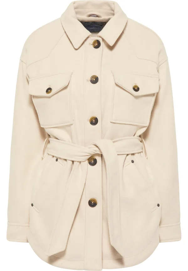 Dit crèmekleurige overgangsjack van DreiMaster Vintage is een tijdloze klassieker voor de herfst. De typische flapkraag, de ietwat nonchalante drapering en de ceintuur met stropdas laten de aloude snit zien. De elegante toets wordt onderstreept door de praktische opgestikte borstzakken en de knopen in hoornlook. Afgeronde zomen en een licht getailleerd model geven het silhouet een vrouwelijke uitstraling. De inhoud van de zijzakken wordt beschermd door een verborgen drukknoop. De borstzak sluit net zo goed met een drukknoop, die versierd is met een liefdevol detail dat typisch is voor DreiMaster vintage. overgangsjasje