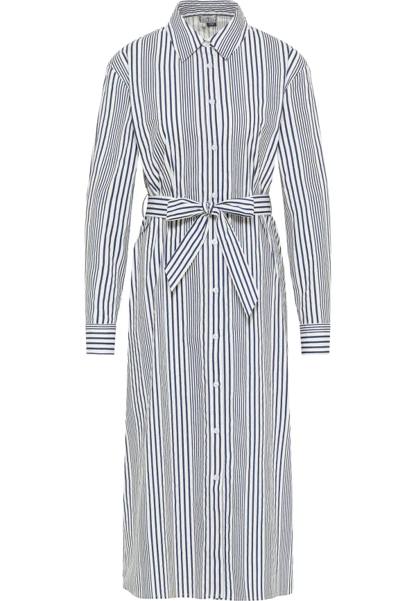 Verrijk je zomergarderobe met de midi-jurk van DreiMaster Maritim. De hoogwaardige verwerking van puur katoen zorgt voor een elegante touch. Het model is gemaakt met een klassieke overhemdkraag, een doorlopende knoopsluiting en sportmanchetten en wordt modieus aangevuld. De knielange jurk wordt gecompleteerd door het maritieme strependessin, de tailleriem van hetzelfde materiaal en heldere lijnen. Jurk