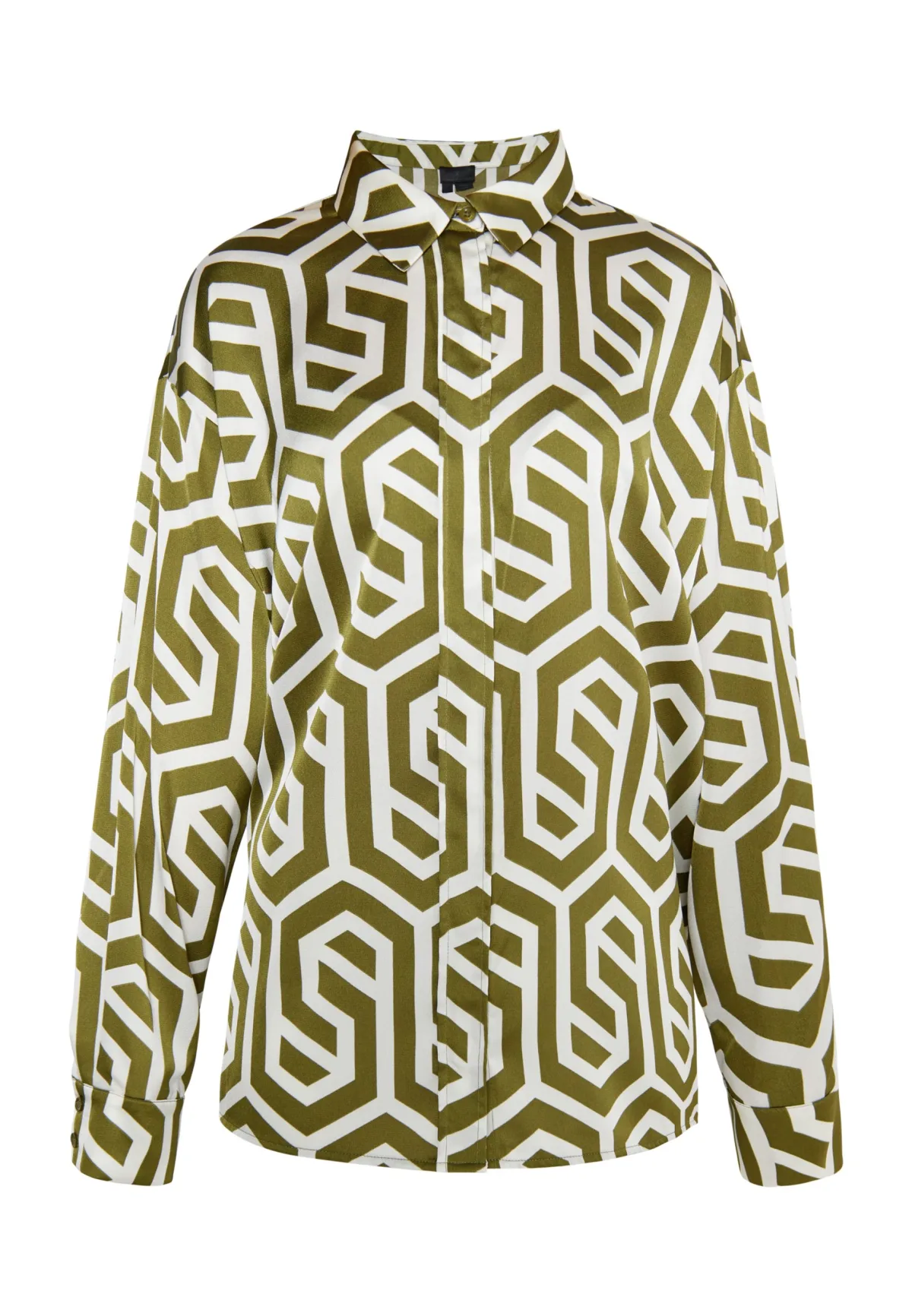 Een zijdezachte, glanzende en vloeiende stof maakt deze blouse van DreiMaster Klassik een 9 tot 5 favoriete outfit. De grote geometrische print en de klassieke overhemdstijl combineren prachtig en zorgen voor een moderne eigentijdse look. overhemdblouse