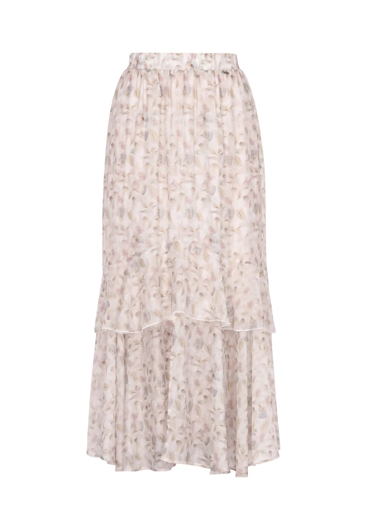 Deze gelaagde rok voegt vrouwelijke charme toe met zijn vloeiende silhouet en gegolfde zomen. De elastische tailleband zorgt voor een comfortabele pasvorm in verschillende maten. De lichte, semi-transparante stof heeft een delicaat bloemmotief. Deze midi- tot maxi-rok is perfect voor casual of semi-formele gelegenheden en biedt een luchtige en sierlijke esthetiek die elke garderobe zal verfraaien. Rock