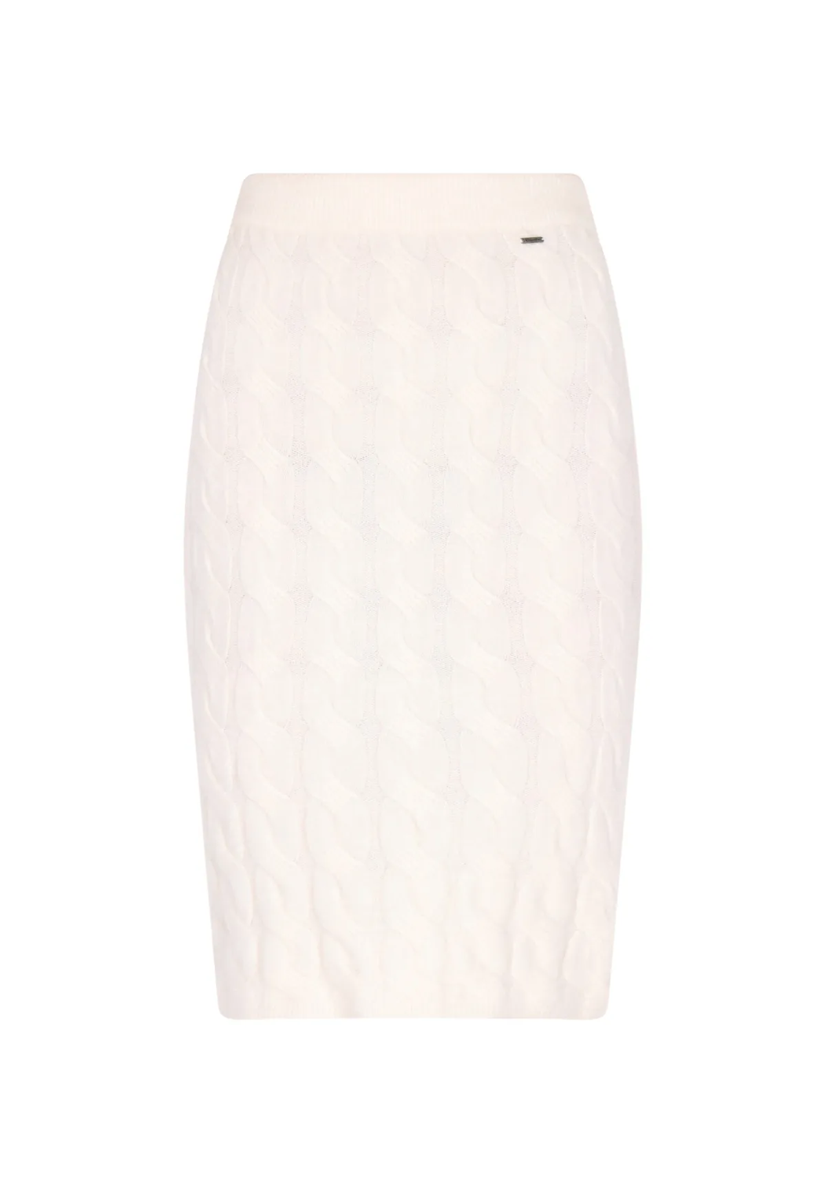Deze gebreide rok heeft een betoverend patroon van in elkaar grijpende rondingen en biedt een prachtig driedimensionaal effect. Het aansluitende silhouet op taillehoogte zorgt voor een elegante en getailleerde look. De geribde tailleband zorgt voor een goede pasvorm, terwijl het embleem bij de tailleband voor een subtiel merkaccent zorgt. Deze rok is gemaakt van dikke en stevige stof en is ideaal voor koelere klimaten en biedt zowel stijl als warmte. Rock