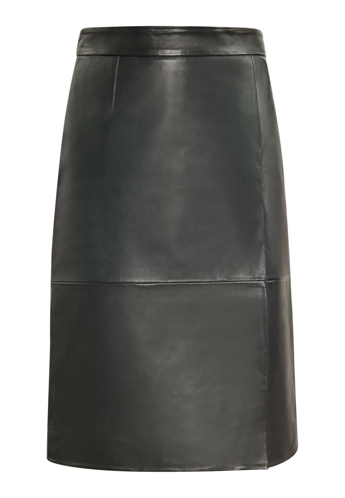 Til je stijl naar een hoger niveau met deze elegante midi-rok met een klassiek A-lijnsilhouet. Het is gemaakt van luxueus lamsleer en heeft een stijlvolle split voor extra flair en een verborgen ritssluiting voor gemak. De hoge tailleband sluit perfect aan op de taille en loopt sierlijk uit aan de zoom, waardoor het een ideale keuze is voor elke gelegenheid. Rock