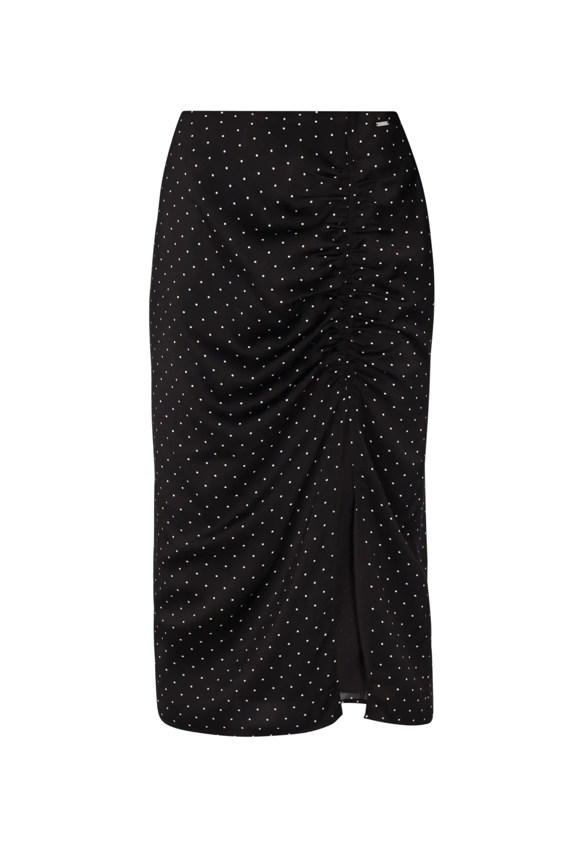 Deze elegante midi-rok heeft een charmante stippenprint en voegt een vleugje eigenzinnigheid toe aan je garderobe. De geweven stof valt prachtig rond de heupen en dijen waardoor je silhouet geaccentueerd wordt. Een uniek plooidetail aan één kant zorgt voor een rucheseffect, terwijl een split de bewegingsvrijheid en stijl verbetert. Perfect voor wie op zoek is naar een gepolijste, elegante look. Rock