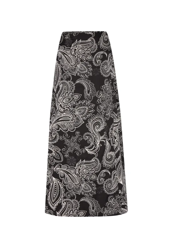 Deze rok is gemaakt met een zwierig, losvallend silhouet en heeft een ingewikkeld paisley- of bloemachtig patroon. De gladde textuur en de lichtgewicht stof zorgen voor een sierlijke drapering vanaf de taille tot halverwege de kuit of enkellengte. Met een brede zoom en verborgen sluiting voor een naadloze look straalt hij elegantie en stijl uit. Rock