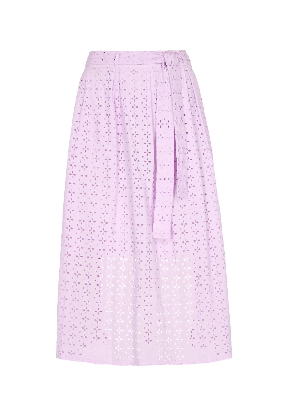 Accentueer je zomerse look met deze midi-rok met hoge taille en stijlvolle stropdas. Het is gemaakt van licht katoen, de voering is doorschijnend en heeft delicate opengewerkte versieringen die textuur toevoegen. Dit elegante ontwerp reikt sierlijk tot halverwege de kuit en heeft een A-lijnsilhouet, perfect voor casual uitstapjes. Rock