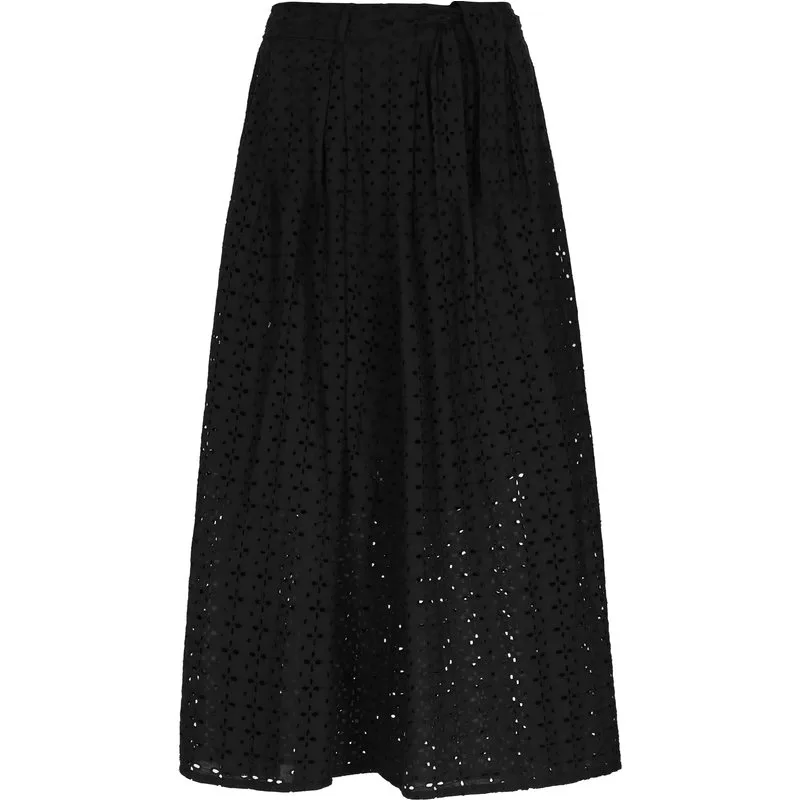 Accentueer je zomerse look met deze midi-rok met hoge taille en stijlvolle stropdas. Het is gemaakt van licht katoen, de voering is doorschijnend en heeft delicate opengewerkte versieringen die textuur toevoegen. Dit elegante ontwerp reikt sierlijk tot halverwege de kuit en heeft een A-lijnsilhouet, perfect voor casual uitstapjes. Rock