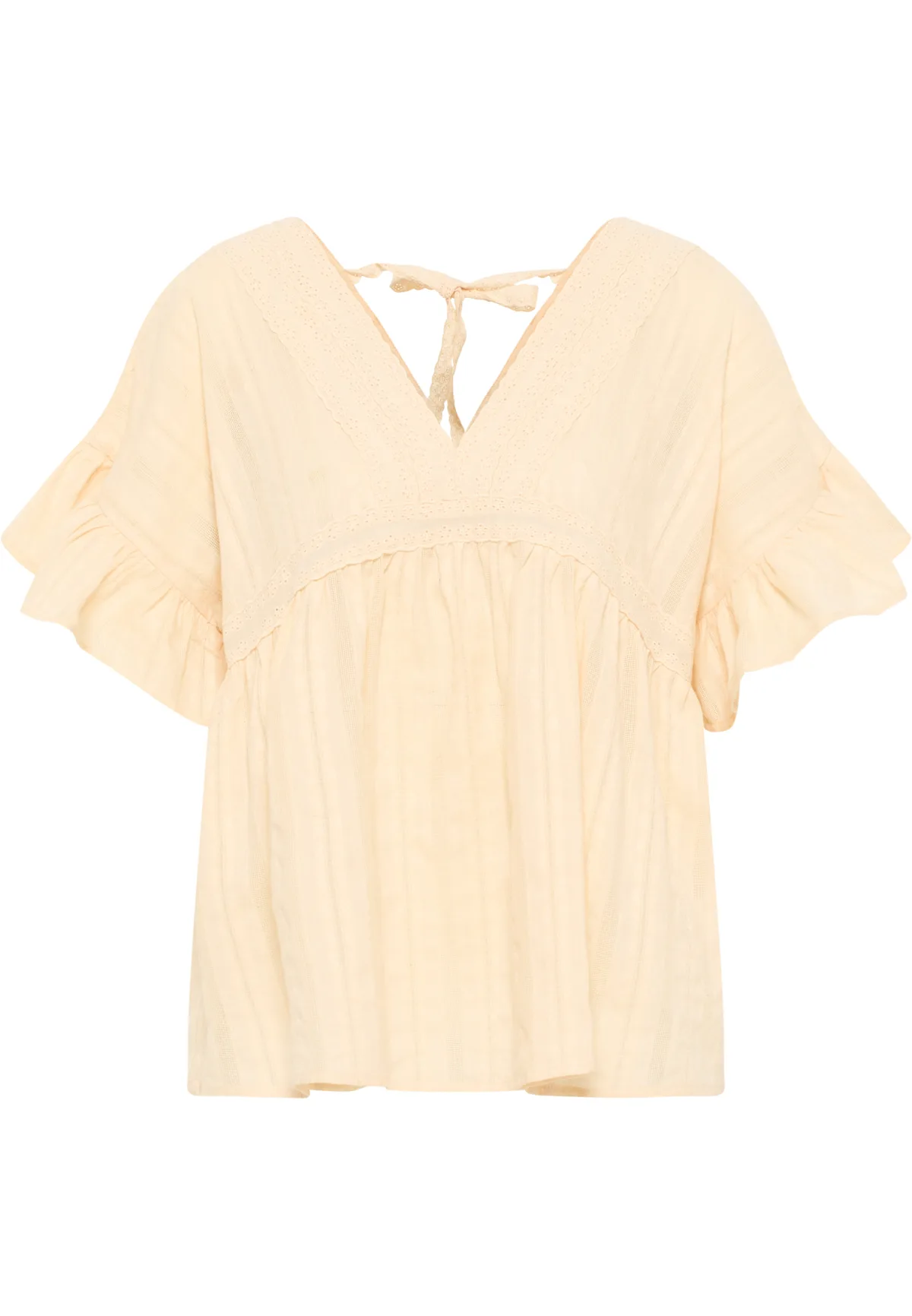 Deze lichte katoenen blouse van DreiMaster Vintage overtuigt door het betoverende gaatjesborduursel en de gedessineerde, fijn gestructureerde katoenen stof. Het lossere silhouet heeft een diepe V-hals aan de voor- en achterkant, die bij elkaar wordt gehouden door een kanten strikje. De romantische ruches aan de mouwen optimaliseren de vrouwelijke boho-look. Dankzij de lichte textuur past hij perfect bij jeans en rokken. Tuniek