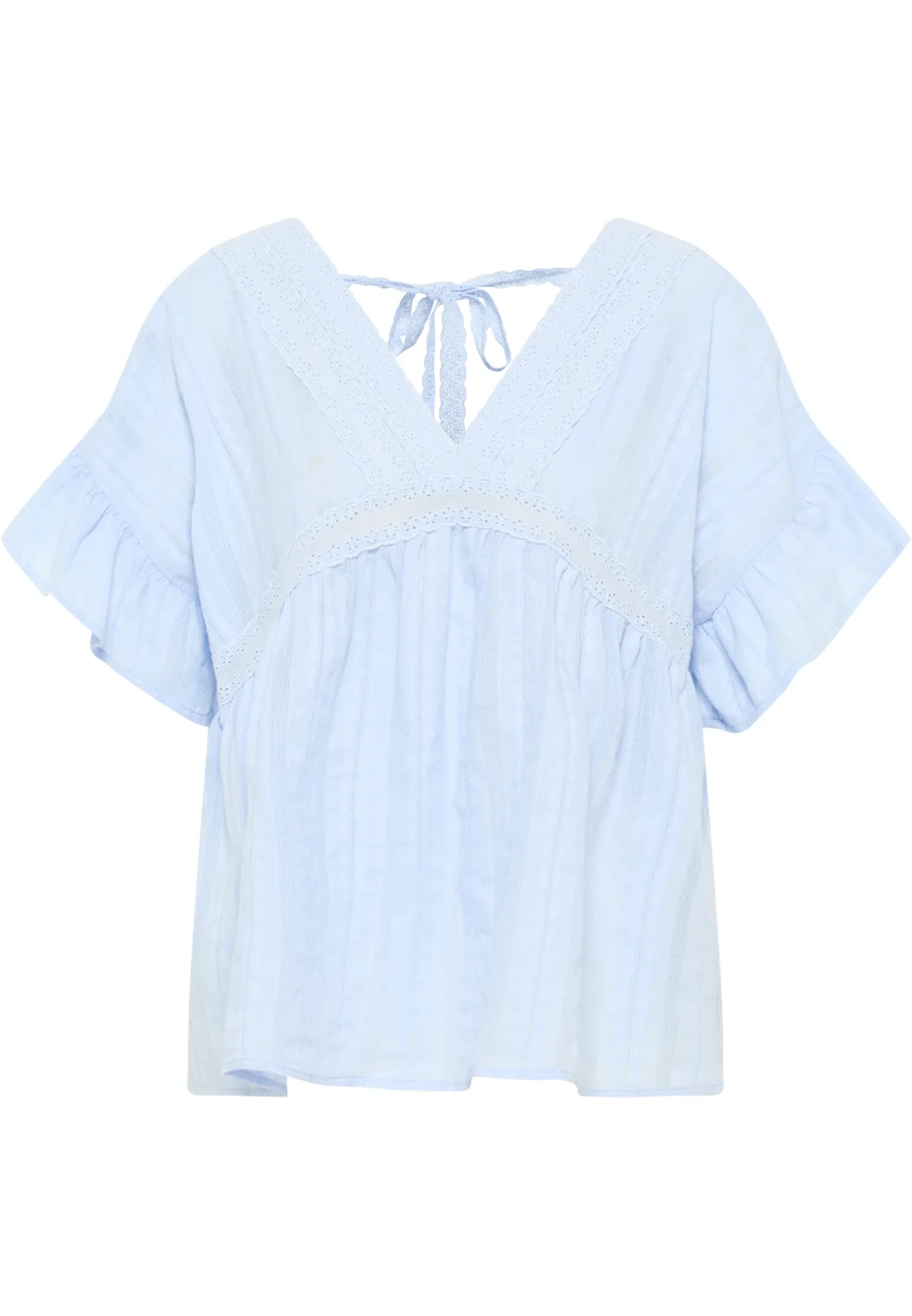 Deze lichte katoenen blouse van DreiMaster Vintage overtuigt door het betoverende gaatjesborduursel en de gedessineerde, fijn gestructureerde katoenen stof. Het lossere silhouet heeft een diepe V-hals aan de voor- en achterkant, die bij elkaar wordt gehouden door een kanten strikje. De romantische ruches aan de mouwen optimaliseren de vrouwelijke boho-look. Dankzij de lichte textuur past hij perfect bij jeans en rokken. Tuniek