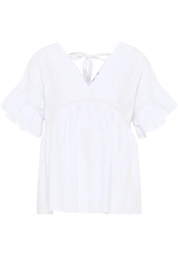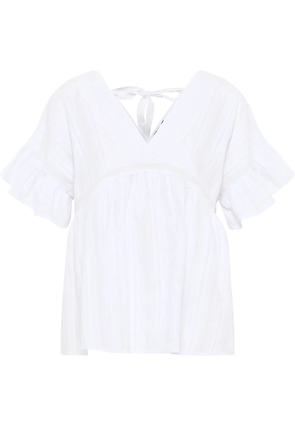 Deze lichte katoenen blouse van DreiMaster Vintage overtuigt door het betoverende gaatjesborduursel en de gedessineerde, fijn gestructureerde katoenen stof. Het lossere silhouet heeft een diepe V-hals aan de voor- en achterkant, die bij elkaar wordt gehouden door een kanten strikje. De romantische ruches aan de mouwen optimaliseren de vrouwelijke boho-look. Dankzij de lichte textuur past hij perfect bij jeans en rokken. Tuniek