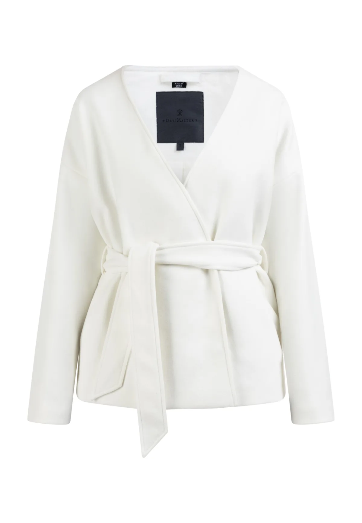 Geen vulling Bij de witte jas van DreiMaster Klassik komen we heldere lijnen en minimalistisch design tegen. Het kraagloze model is gemaakt van een zachte materiaalmix met wol en heeft een open voorkant en een accentuerende tailleriem die het open model samenbindt. Twee zijzakken maken het design losser en wordt gesloten met twee drukknopen. Tussenjas gemaakt van een wolmix