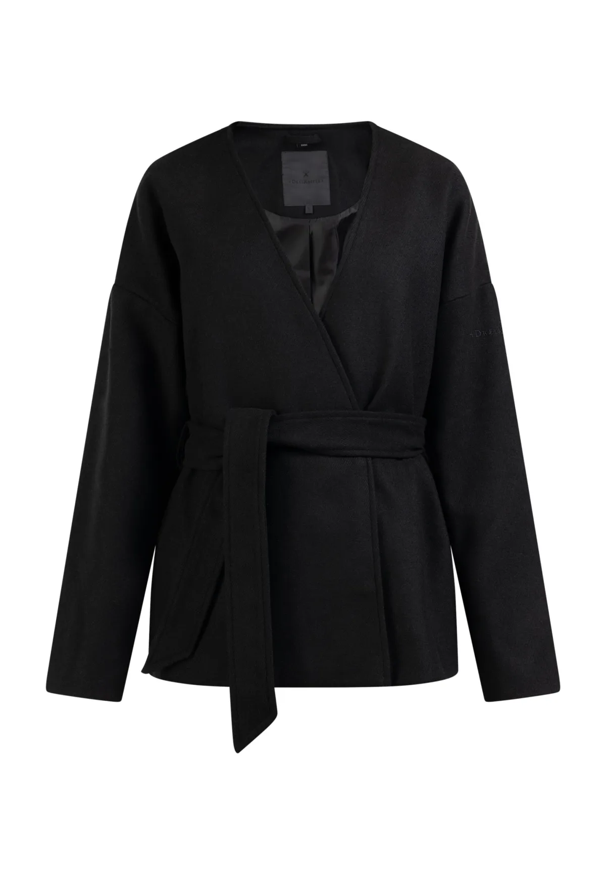 Geen vulling Bij de jas van DreiMaster Klassik komen we heldere lijnen en minimalistisch design tegen. Het kraagloze model is gemaakt van een zachte materiaalmix met wol en heeft een open voorkant en een accentuerende tailleriem die het open model samenbindt. Twee zijzakken maken het design losser en wordt gesloten met twee drukknopen. Tussenjas gemaakt van een wolmix