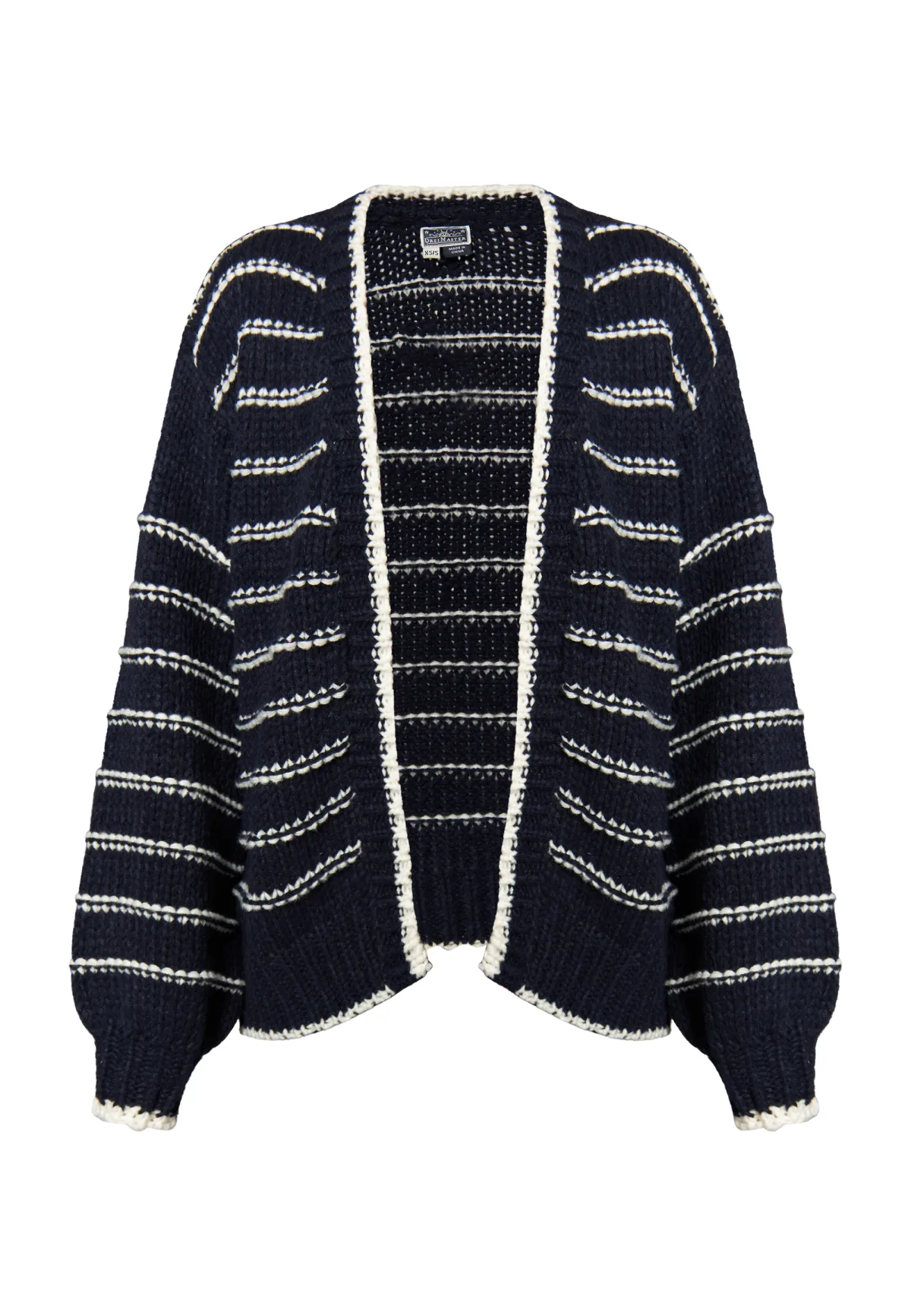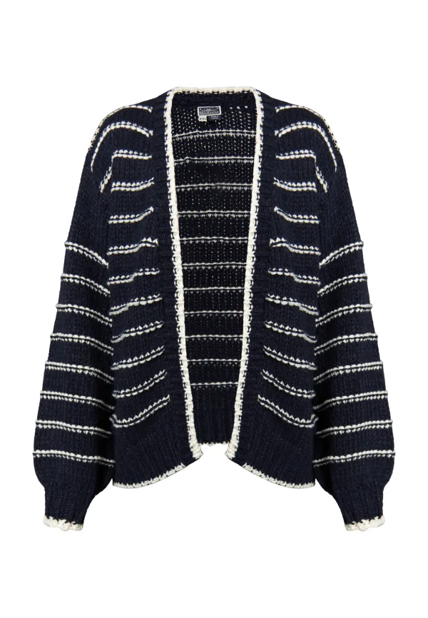 Het grove, dikke garen met 3D-streeppatroon symboliseert een frisse zeebries en geeft het DreiMaster Maritim vest een moderne uitstraling. De open pasvorm wordt ondersteund door de contrasterende kleuren en de wijde mouwen met smal toelopende manchetten zorgen voor een mooi volume. Vest