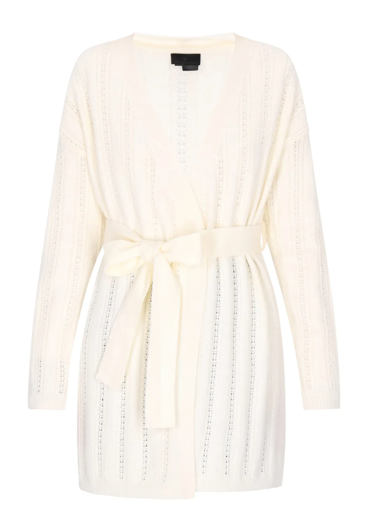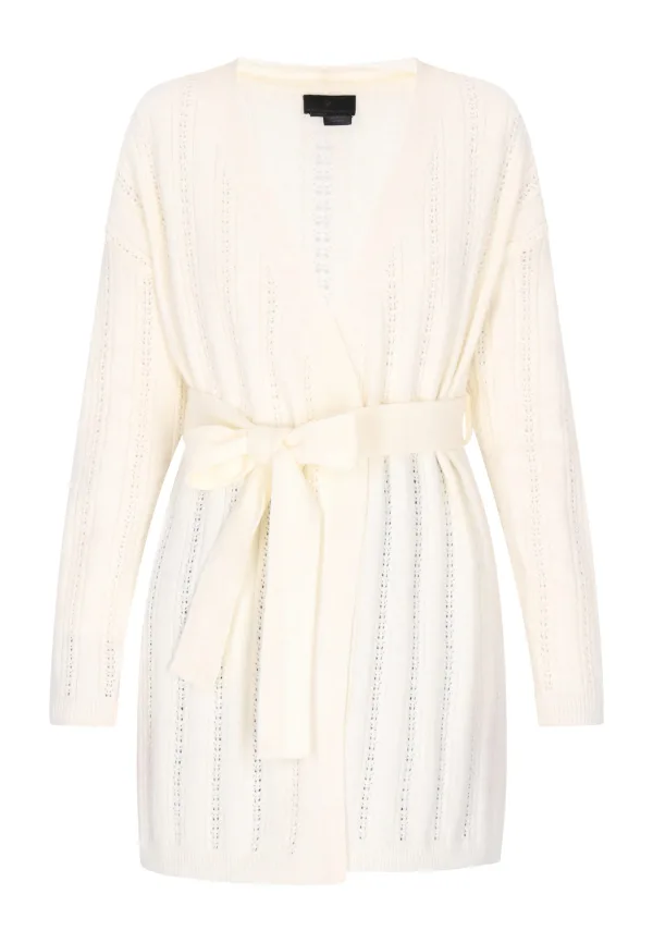 Deze stijlvolle en veelzijdige toevoeging aan je garderobe heeft een gestructureerd gebreid patroon met een V-hals en een open voorkant. Met de bijpassende riem kun je dit gezellige kledingstuk vastmaken - perfect om warmte en comfort toe te voegen aan je dagelijkse look. Geribbelde textuur langs de zoom, manchetten en randen aan de voorkant voegen extra structuur toe aan dit casual en toch chique kledingstuk. Vest