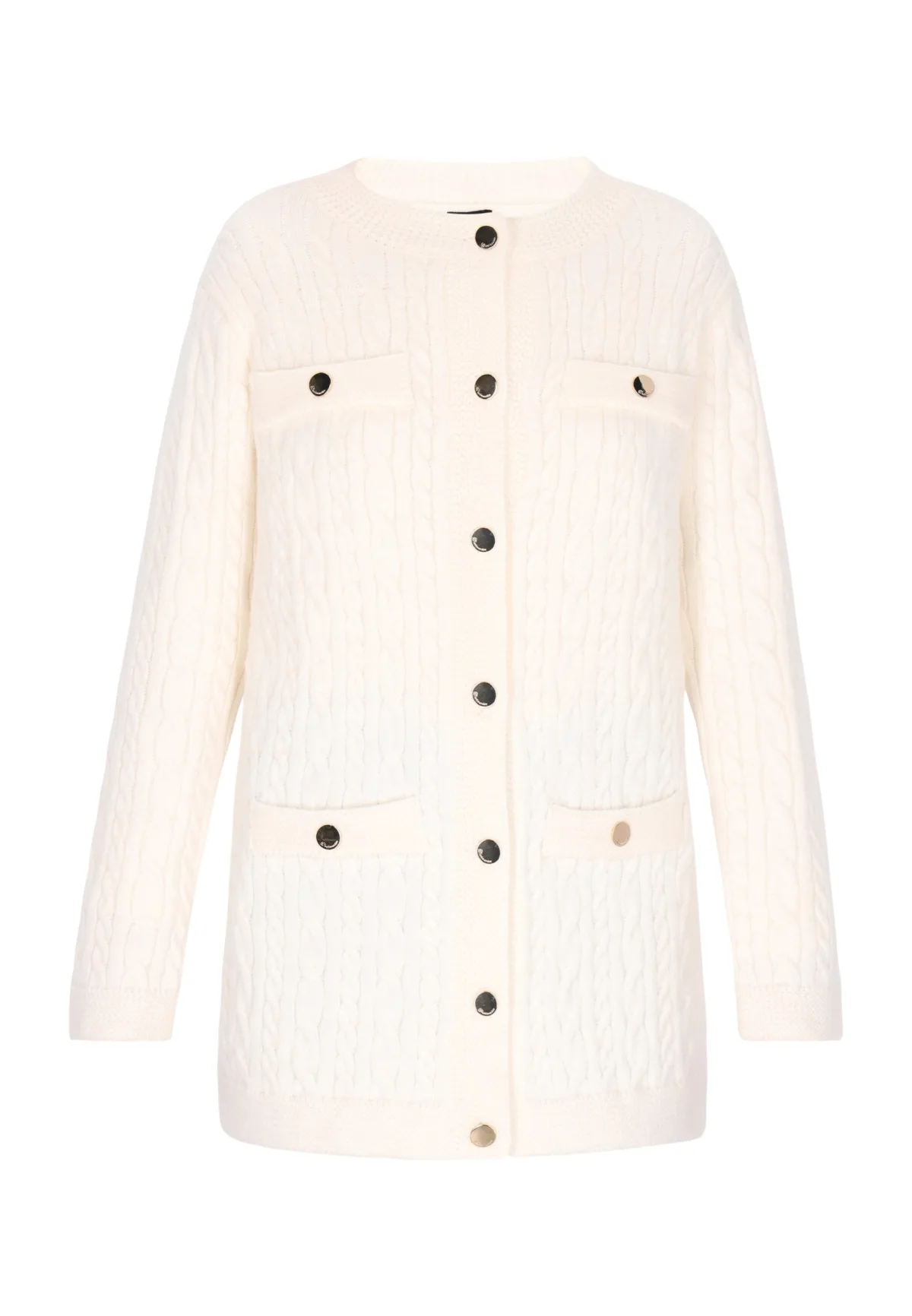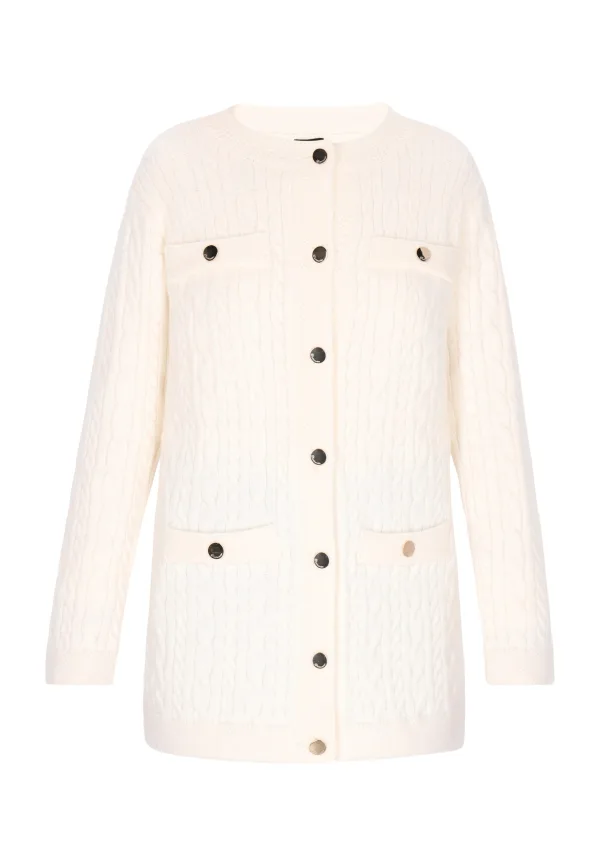 Trakteer uzelf op het luxueuze comfort en de tijdloze stijl van dit elegante vest. Met zijn geribbelde structuur en kabelpatroon straalt hij pure verfijning uit. De ronde hals en knoopsluiting geven het een elegante touch, terwijl de zakken versierd met metalen versieringen een vleugje glamour bieden. Dit halflange vest is afgewerkt met geribde manchetten en zoom voor een comfortabele pasvorm en is perfect om warmte en stijl toe te voegen aan elke outfit. Vest