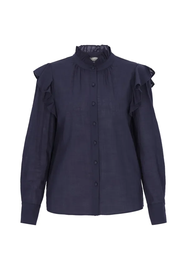 Blouse type: Klassieke blouse; Design: Knop placket; Type sluiting: Knoopsluiting; Materiaal: Katoen; Motief: Effen; Kraag: Opstaande kraag; Details: Ruches, Gedrapeerd; Extra's: Op staal naden, Vintage; Pasvorm: Normale pasvorm; Armlengte: Lange mouw; Lengte: Normale lengte