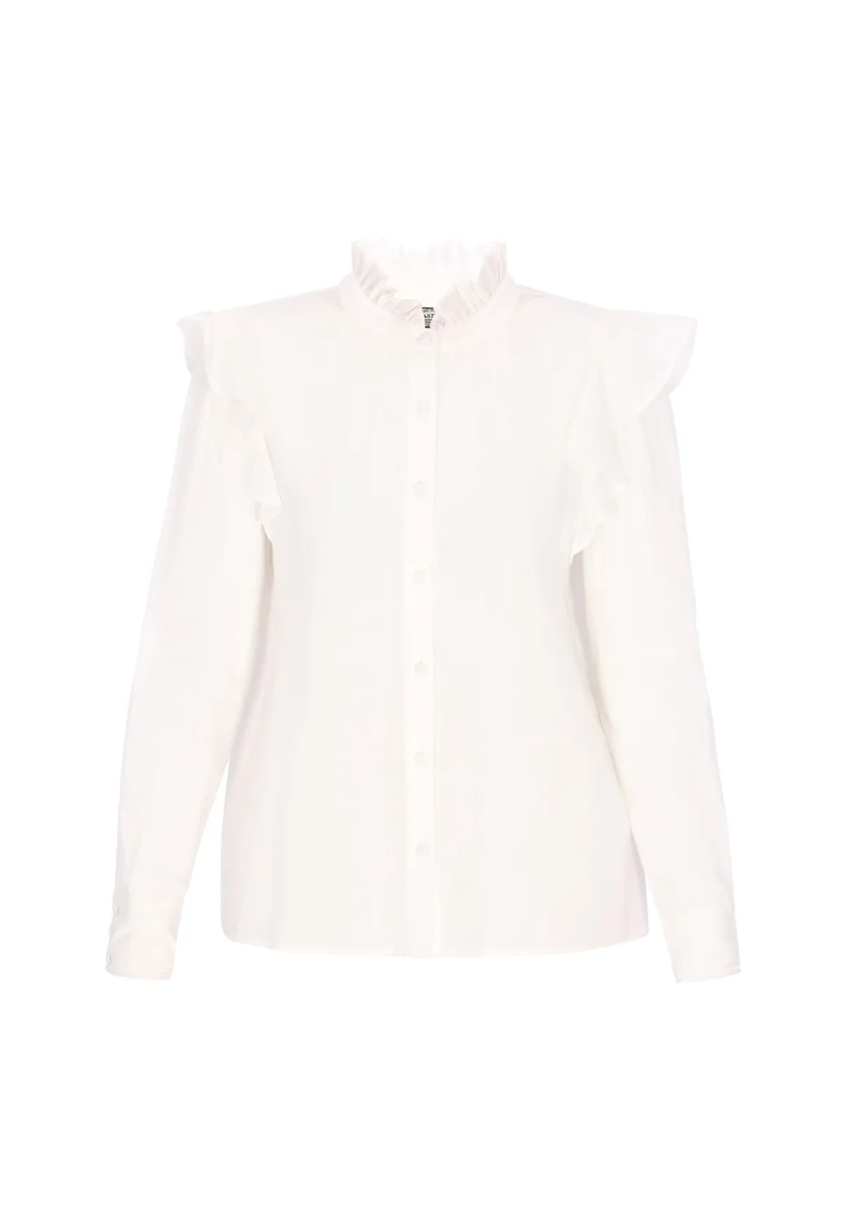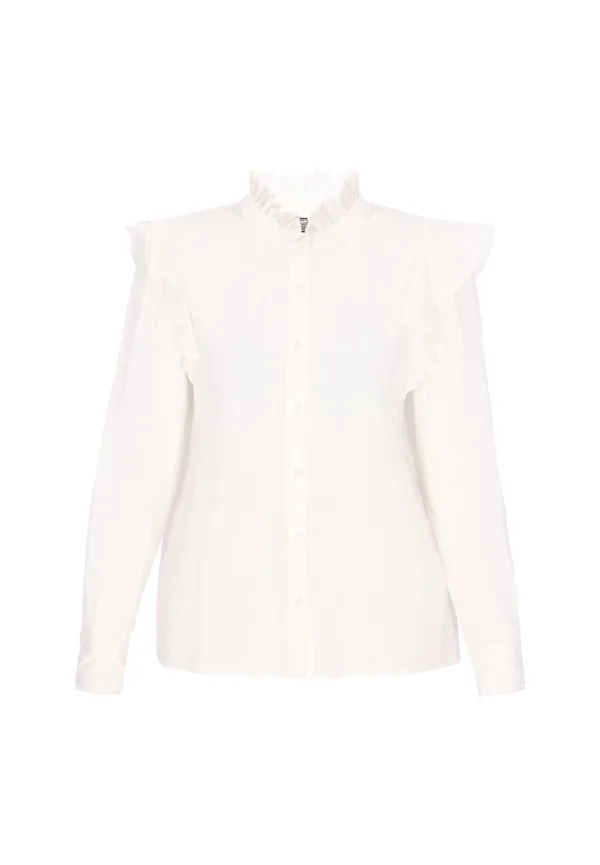 Blouse type: Klassieke blouse; Design: Gevoerde zoom/rand, Knop placket; Type sluiting: Knoopsluiting; Materiaal: Katoen; Motief: Effen; Kraag: Opstaande kraag; Details: Ruches, Gedrapeerd; Extra's: Label plaatje, Op staal naden; Pasvorm: Normale pasvorm; Armlengte: Lange mouw; Lengte: Normale lengte