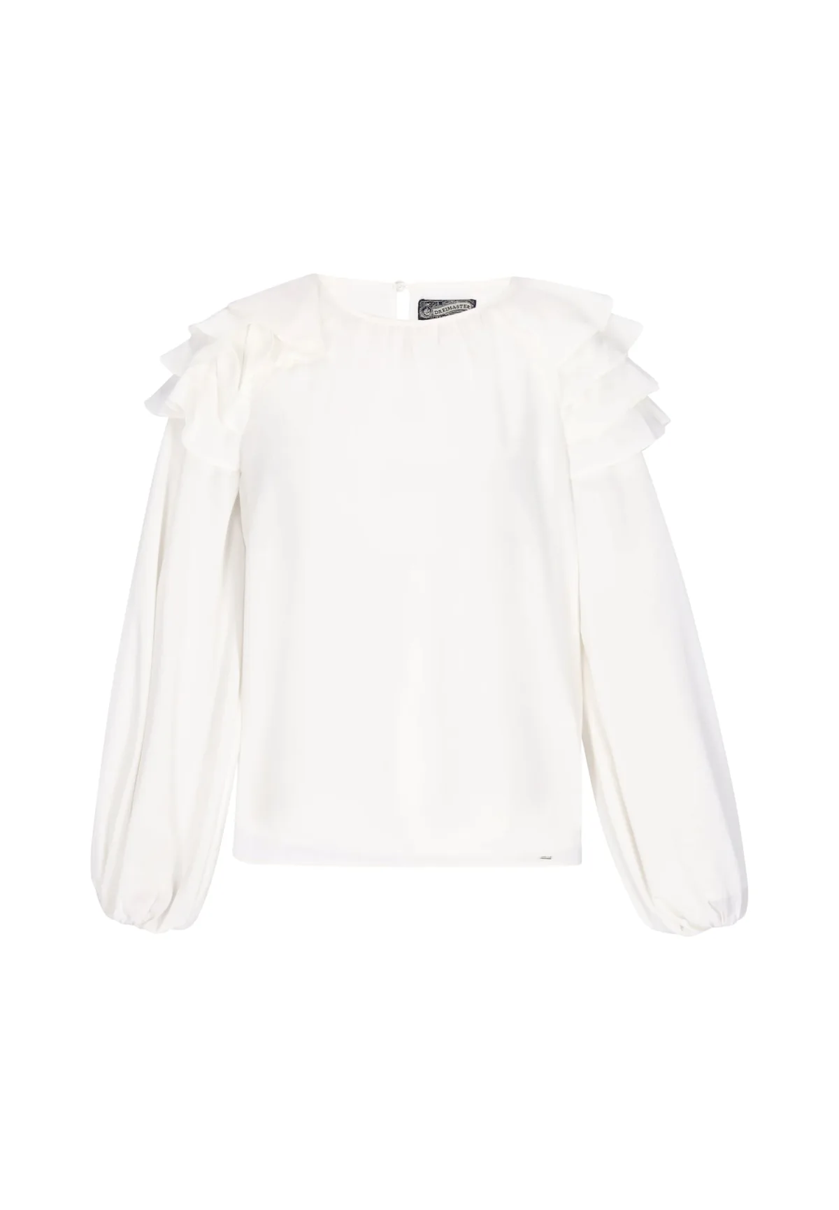 Blouse type: Klassieke blouse; Design: Rechte zoom; Type sluiting: Knoopsluiting; Motief: Effen; Kraag: Zonder kraag; Details: Ruches, Gedrapeerd; Extra's: Op staal naden; Pasvorm: Normale pasvorm; Armlengte: Lange mouw; Lengte: Normale lengte