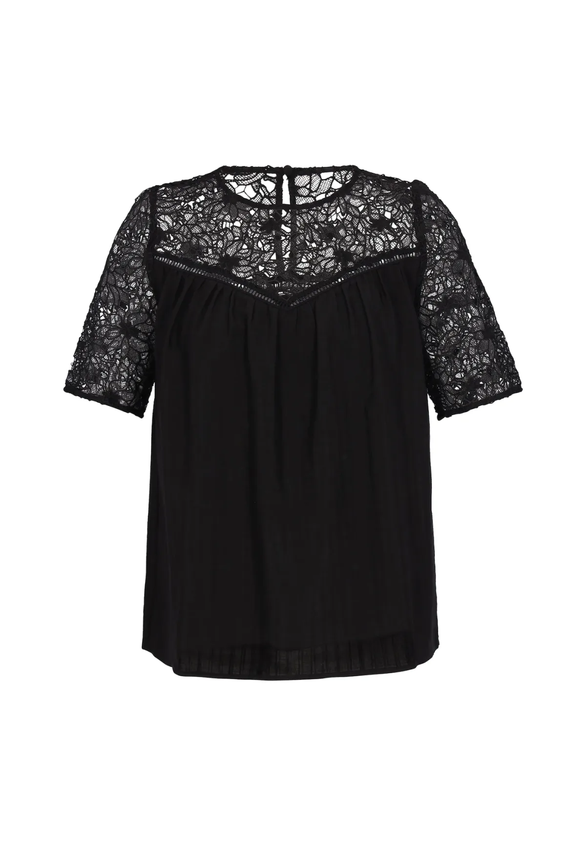 Blouse type: Blouseshirt; Design: Keyholesluiting; Type sluiting: Knoopsluiting; Materiaal: Viscose; Motief: Effen; Kraag: Zonder kraag; Details: Kant, Gedrapeerd; Extra's: Op staal naden; Pasvorm: Normale pasvorm; Armlengte: Kwartmouw; Lengte: Normale lengte