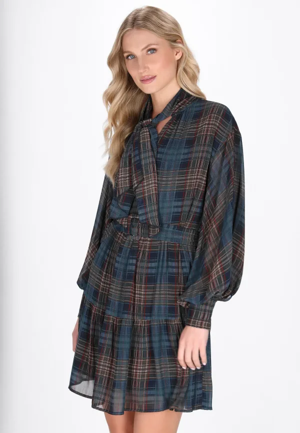 Design: Gevoerde zoom/rand; Type sluiting: Knoopsluiting; Materiaal: Chiffon; Motief: Geruit; Kraag: Strik; Details: Volant, Gedrapeerd; Extra’s: All-over patroon, Burnout effect, Oplichtende stof; Lengte: Kort/mini; Snit: Getailleerd; Pasvorm: Normale pasvorm; Armlengte: Lange mouw