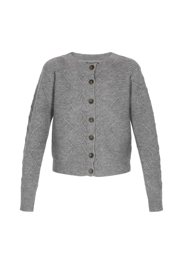 Design: Geribbelde kraag, Knop placket, Geribd ceintuurtje; Type sluiting: Knoopsluiting; Materiaal: Knitwear; Halstype: Ronde hals; Motief: Mélange; Extra's: All-over patroon, Op staal naden, Met textuur; Pasvorm: Normale pasvorm; Armlengte: Lange mouw; Lengte: Normale lengte