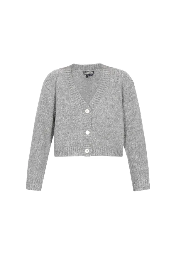 Design: Geribd ceintuurtje; Type sluiting: Knoopsluiting; Materiaal: Knitwear; Halstype: V-hals; Motief: Mélange; Extra's: Voelt zacht aan; Pasvorm: Normale pasvorm; Armlengte: Lange mouw; Lengte: Normale lengte