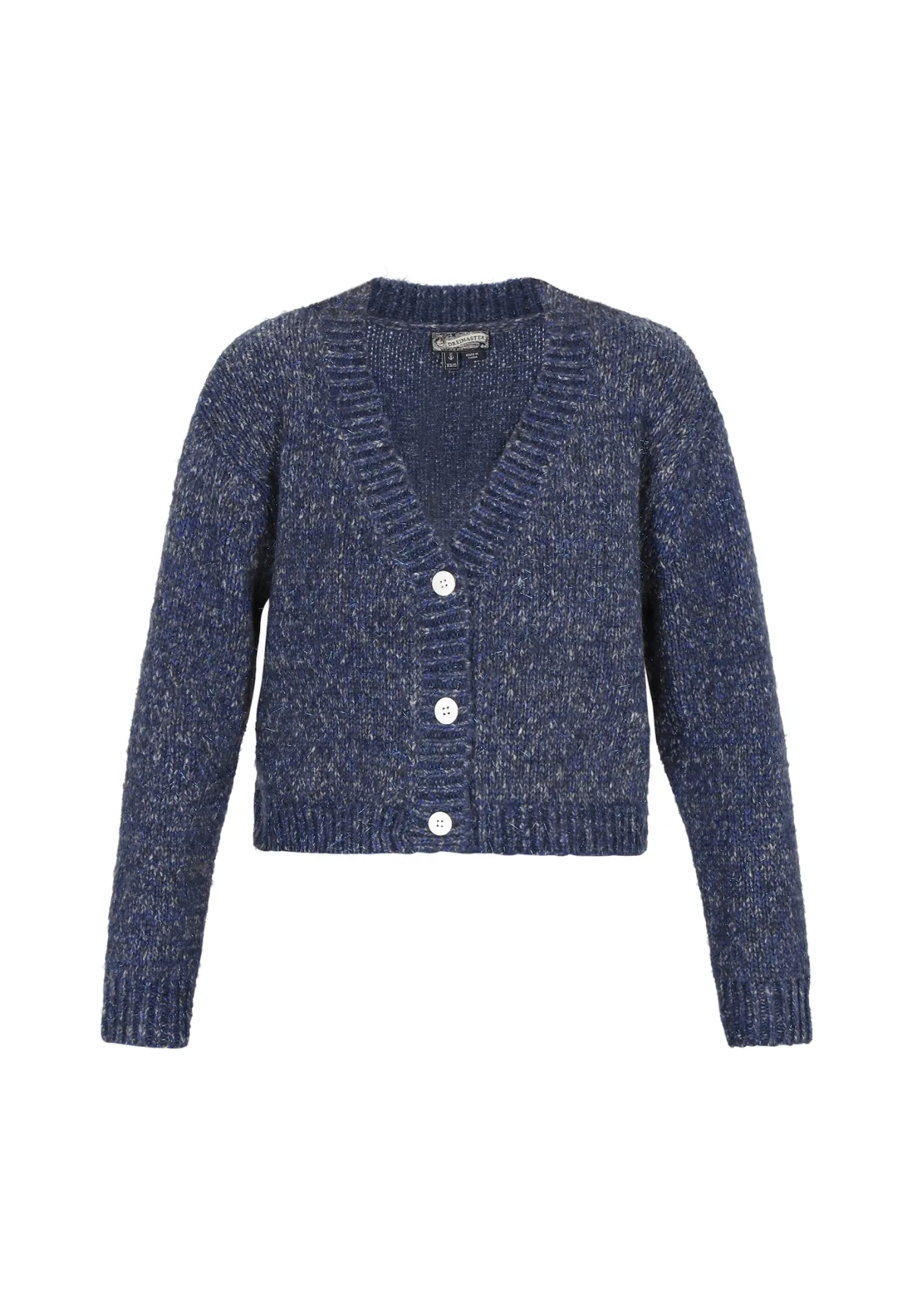 Design: Geribbelde kraag, Geribd ceintuurtje, Overcut schouder; Type sluiting: Knoopsluiting; Materiaal: Knitwear; Halstype: V-hals; Motief: Mélange; Extra's: Glitterend; Pasvorm: Normale pasvorm; Armlengte: Lange mouw; Lengte: Normale lengte