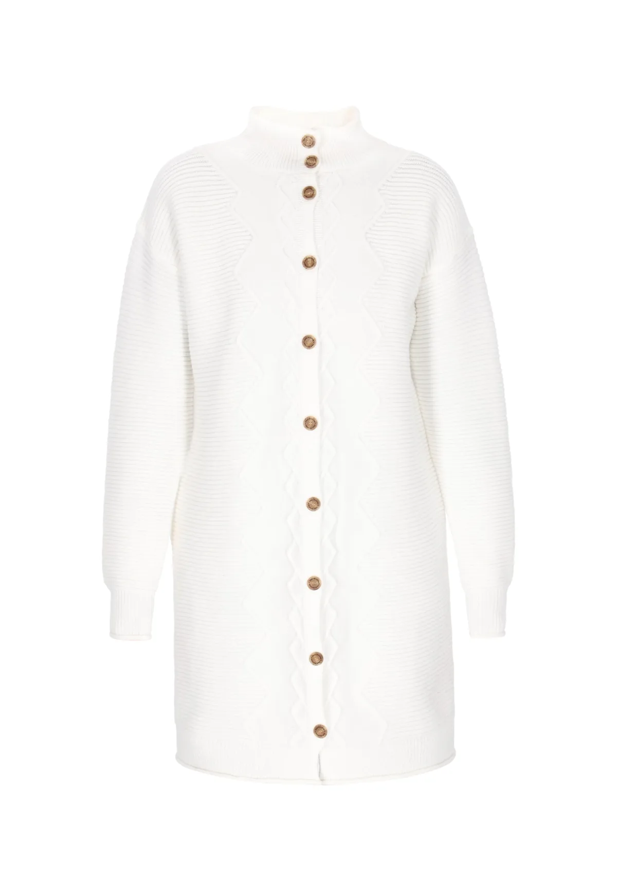 Design: Rechte zoom, Recht model, Geribd ceintuurtje; Type sluiting: Knoopsluiting; Materiaal: Knitwear; Halstype: Opstaande kraag; Motief: Effen; Extra's: Op staal naden, Met textuur, Voelt zacht aan; Pasvorm: Normale pasvorm; Armlengte: Lange mouw; Lengte: Lange pasvorm