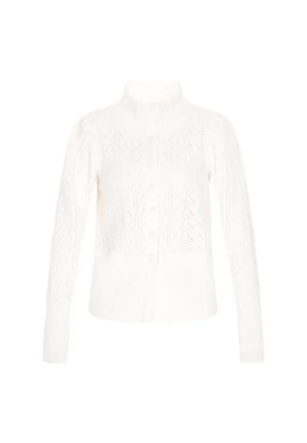 Design: Geribbelde kraag, Knop placket, Pofmouwen, Geribd ceintuurtje, Duimopening; Type sluiting: Knoopsluiting; Materiaal: Knitwear; Halstype: Opstaande kraag; Motief: Effen; Details: Gedrapeerd, Mesh; Extra's: Label plaatje, Met textuur, Voelt zacht aan, Overdekte knopen; Pasvorm: Normale pasvorm; Armlengte: Lange mouw; Lengte: Normale lengte