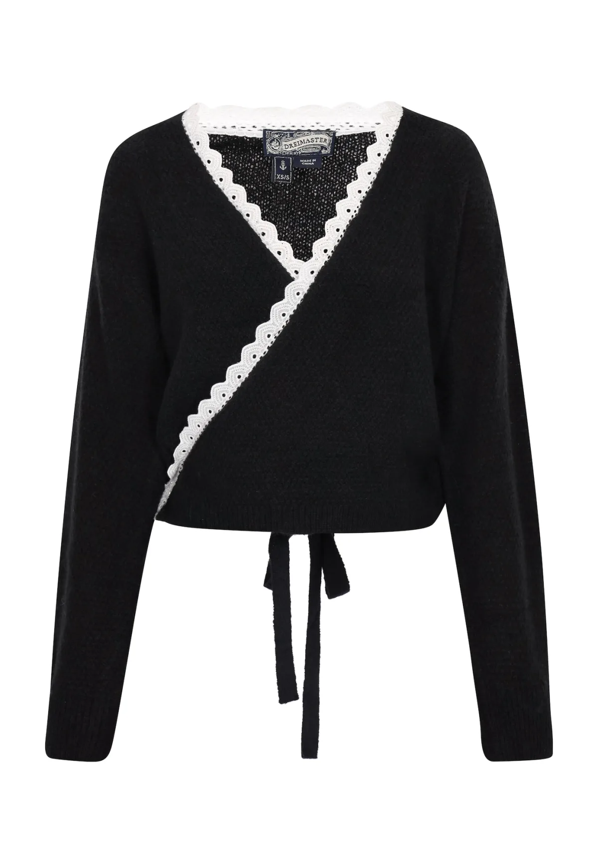 Design: Overcut schouder, Om te knopen/binden; Materiaal: Knitwear; Halstype: V-hals; Details: Kant, Wikkel design; Extra's: Fully fashioned, Met textuur; Pasvorm: Losse pasvorm; Armlengte: Lange mouw; Lengte: Normale lengte