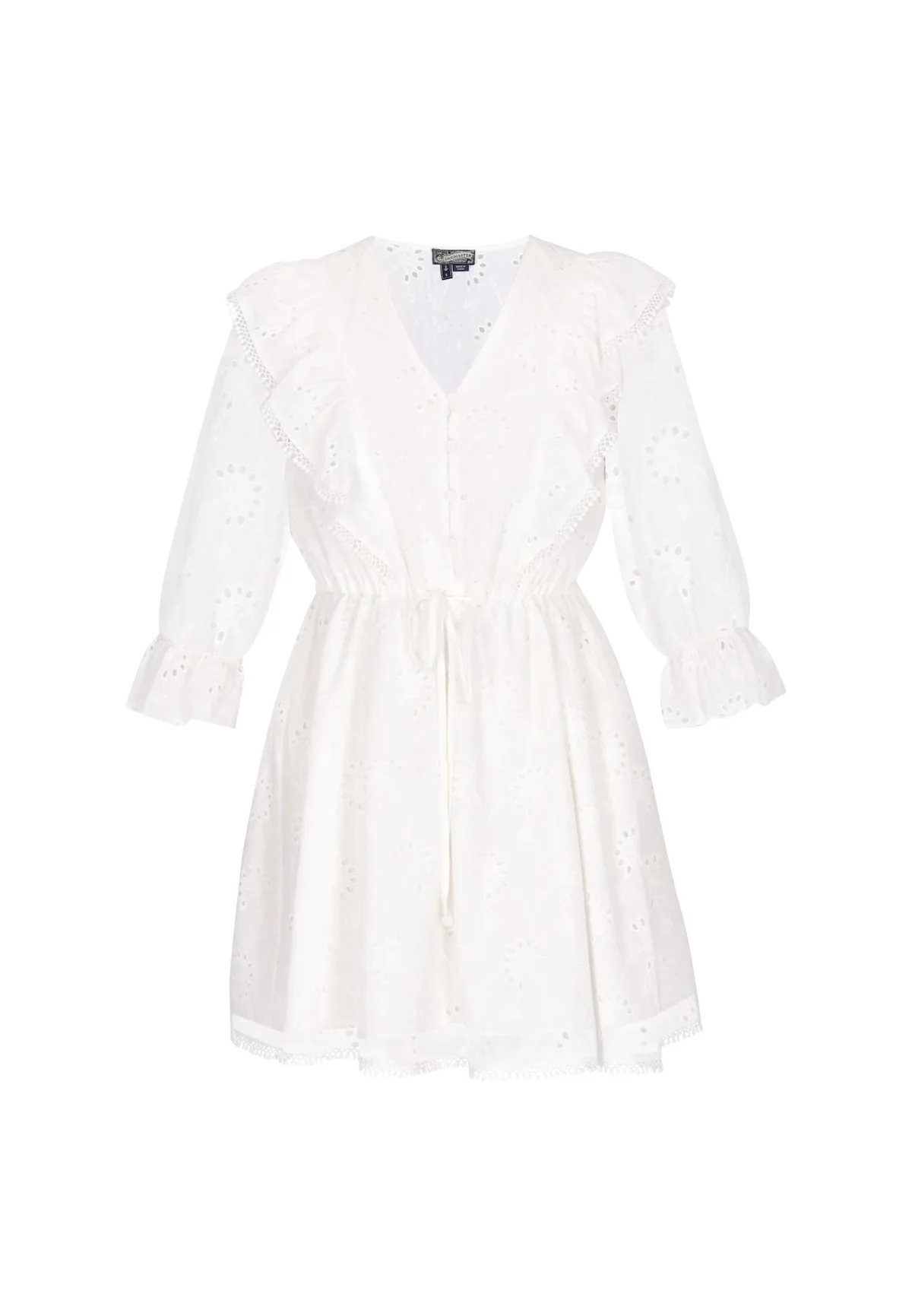 Design: Knop placket, Met onderrok, Zoom/rand met boord; Type sluiting: Knoopsluiting; Materiaal: Katoen; Halstype: V-hals; Motief: Bloemenprint; Details: Ruches, Borduursels, Mesh; Extra's: Label plaatje, Verstelbare taille, Voelt zacht aan; Lengte: Knielengte; Snit: Getailleerd; Pasvorm: Normale pasvorm; Armlengte: Driekwart mouw