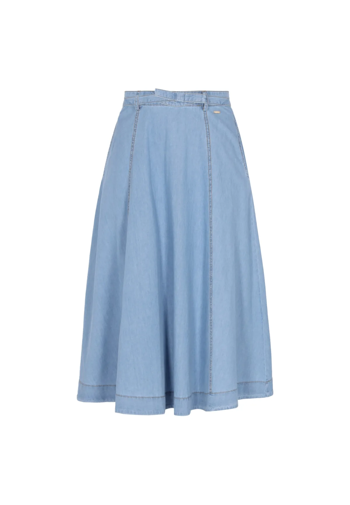 Design: Met riem, Zakken aan de zijkant; Type sluiting: Ritssluiting; Materiaal: Denim; Motief: Effen; Details: Plooien; Extra's: Vaste grip; Lengte: Knielengte; Pasvorm: Normale pasvorm; Taillehoogte: High waist