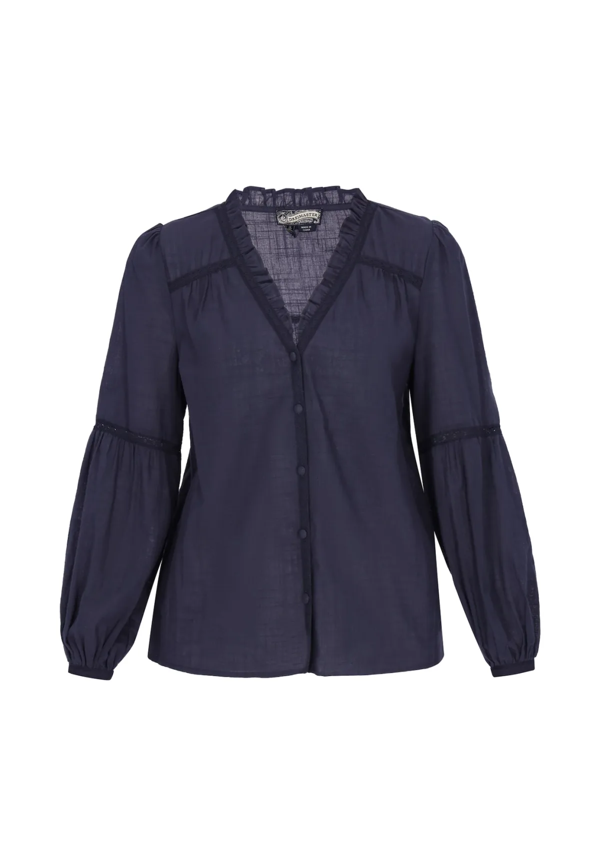 Type sluiting: Knoopsluiting; Materiaal: Katoen; Halstype: V-hals; Motief: Effen; Details: Ruches; Pasvorm: Normale pasvorm; Armlengte: Lange mouw; Lengte: Normale lengte