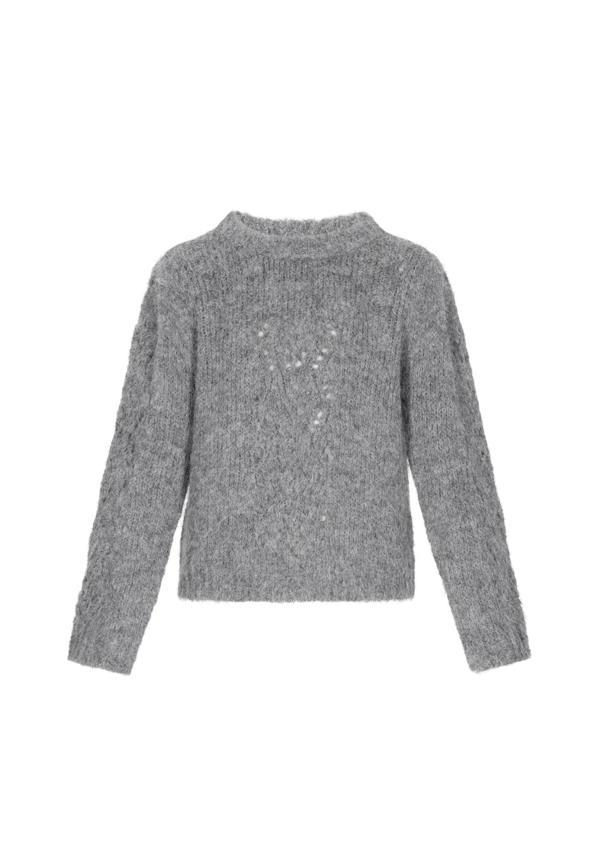 Design: Geribbelde kraag, Geribd ceintuurtje; Materiaal: Knitwear; Halstype: Ronde hals; Motief: Mélange; Details: Gedrapeerd, Mesh; Extra's: Fully fashioned; Pasvorm: Normale pasvorm; Armlengte: Lange mouw; Lengte: Normale lengte