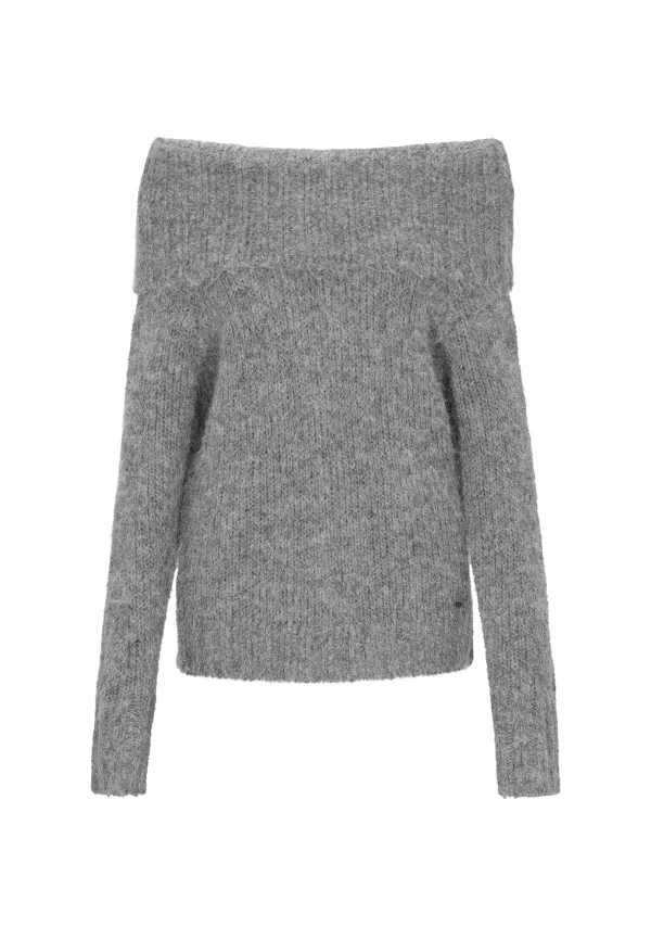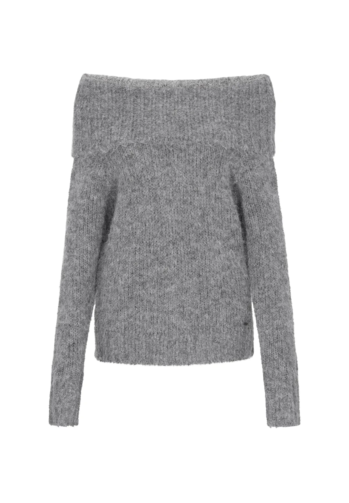 Design: Geribd ceintuurtje; Type sluiting: Slip; Materiaal: Knitwear; Halstype: Carmen hals; Motief: Mélange; Extra's: Fully fashioned; Pasvorm: Normale pasvorm; Armlengte: Lange mouw; Lengte: Normale lengte