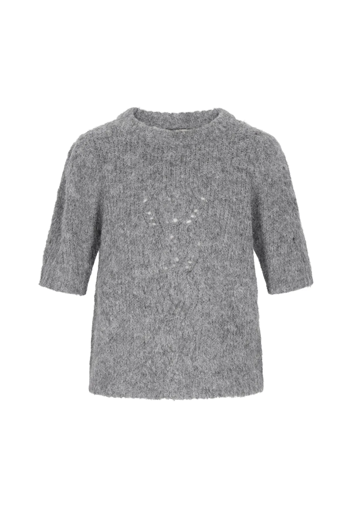 Design: Geribbelde kraag, Geribd ceintuurtje; Materiaal: Knitwear; Halstype: Ronde hals; Motief: Mélange; Details: Mesh; Extra's: Fully fashioned; Pasvorm: Losse pasvorm; Armlengte: Halve mouw; Lengte: Normale lengte