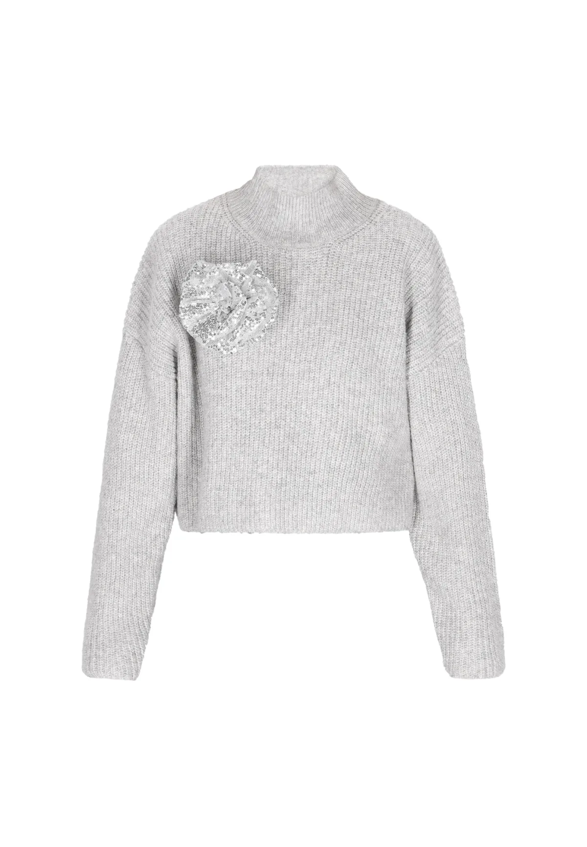 Design: Geribbelde kraag, Geribd ceintuurtje, Staande kraag; Type sluiting: Slip; Materiaal: Knitwear; Halstype: Col; Motief: Mélange; Details: Pailletten; Extra's: Op staal naden, Voelt zacht aan; Pasvorm: Normale pasvorm; Armlengte: Lange mouw; Lengte: Korte pasvorm