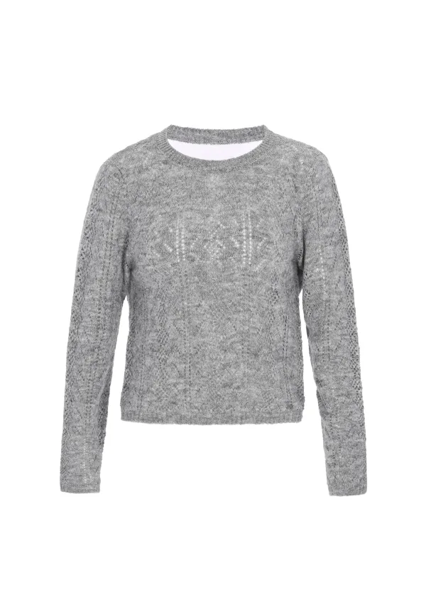 Design: Geribbelde kraag, Geribd ceintuurtje, Uitgesneden rug; Materiaal: Knitwear; Halstype: Ronde hals; Motief: Mélange; Details: Mesh, Backless; Extra's: Patroon gebreid, Fully fashioned, Met textuur, Voelt zacht aan; Pasvorm: Normale pasvorm; Armlengte: Lange mouw; Lengte: Normale lengte