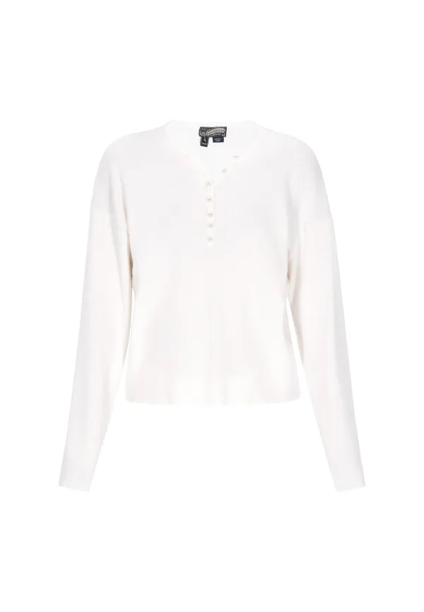 Design: Geribd ceintuurtje; Type sluiting: Knoopsluiting; Materiaal: Knitwear; Halstype: Henley hals; Motief: Effen; Details: Parels; Extra's: Fully fashioned; Pasvorm: Losse pasvorm; Armlengte: Lange mouw; Lengte: Normale lengte