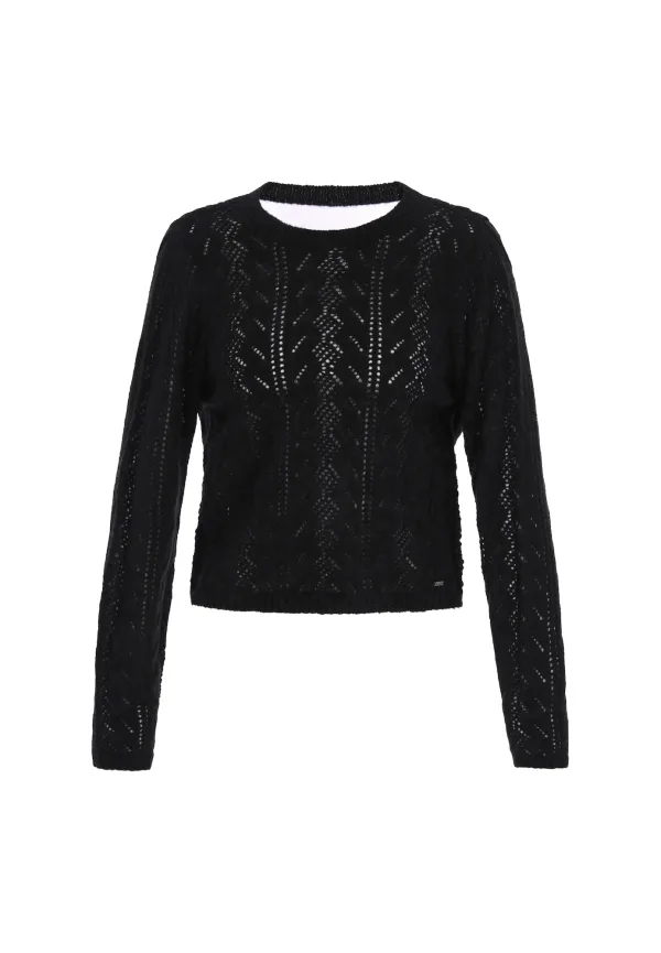 Design: Geribbelde kraag, Geribd ceintuurtje, Uitgesneden rug; Materiaal: Knitwear; Halstype: Ronde hals; Motief: Effen; Details: Mesh, Backless; Extra's: Licht transparant, Patroon gebreid, Met textuur, Voelt zacht aan; Pasvorm: Normale pasvorm; Armlengte: Lange mouw; Lengte: Normale lengte