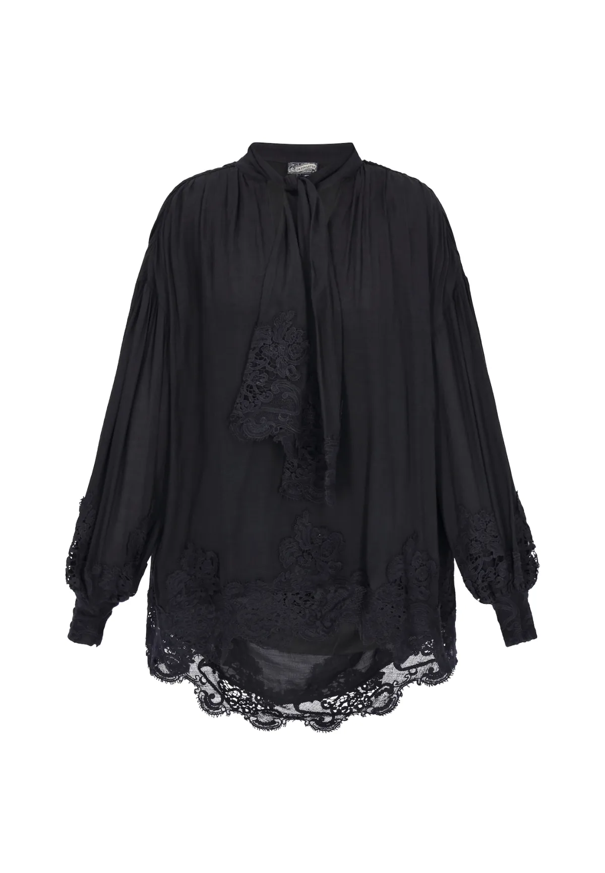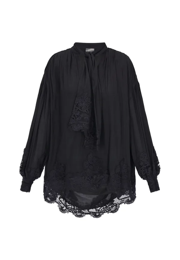 Design: Pofmouwen, Zoom/rand met boord, Overcut schouder, Verlengd rugpand, Om te knopen/binden; Materiaal: Viscose; Motief: Effen; Kraag: Strik; Details: Kant, Gedrapeerd; Extra's: Op staal naden, Gladde stof; Pasvorm: Losse pasvorm; Armlengte: Lange mouw; Lengte: Lange pasvorm