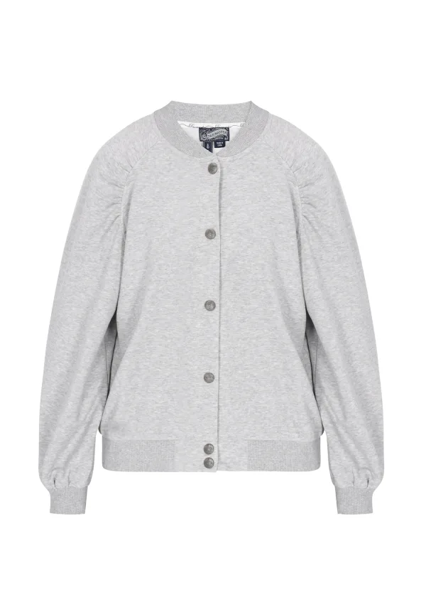 Design: Geribd ceintuurtje; Type sluiting: Drukknoop; Type jas: College jacket; Voering: Niet gevoerd; Materiaal: Sweatstof; Halstype: Opstaande kraag; Motief: Mélange; Details: Gedrapeerd; Extra's: Voelt zacht aan; Pasvorm: Losse pasvorm; Armlengte: Lange mouw; Lengte: Normale lengte