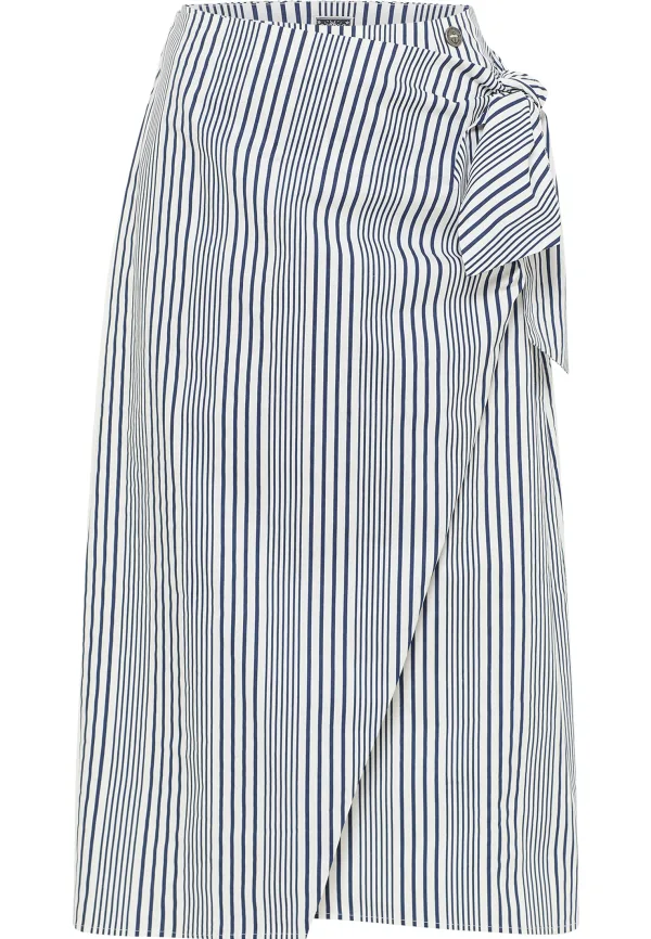 De maritieme gestreepte look, een verfijnd asymmetrisch silhouet met strikdetail in de taille en een zacht katoenen materiaal maken deze kuitlange wikkelrok van DreiMaster Maritim tot de perfecte zomerrok. Gecombineerd met een T-shirt, sandalen of sneakers zitten we mentaal onder parasols of flaneren we langs de strandpromenade. Wikkelrok
